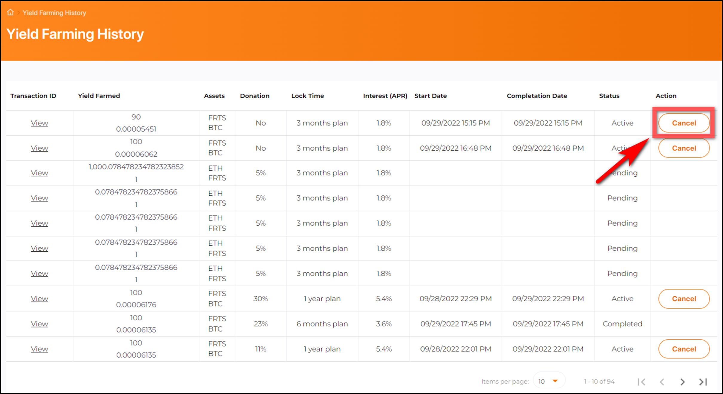 * On the Farming History screen, press the “Cancel” → Display the “Cancel Yield Farming” popup.